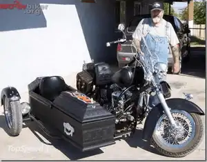 If you favour the macabre, a coffin sidecar is perfectly unusual. With side handles and flame decal, it's attached to a powerful stock cruiser for added “bad to the bone” attitude.
