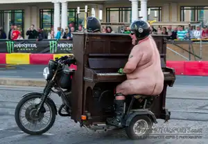 Bringing a whole new meaning to the road trip soundtrack, the fully playable piano sidecar brings music where it rides. What would make this invention even more bizarre? Playing it naked of course.