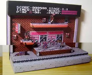Noted for its difficulty, Ninja Gaiden was first released in 1989. Another intricately crafted diorama this includes some great detail. Here, the game’s main protagonist Ryu fights off 4 enemies in the original platform format. Notice the attention to detail in the pixelated brickwork and Cola sign.